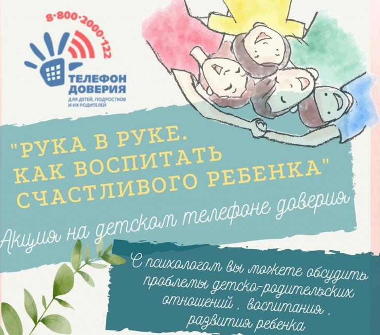 С 01 по 30 сентября 2020 года Детский телефон доверия с единым общероссийским номером 8-800-2000-122 проводит акцию «Рука в руке. Как воспитать счастливого ребенка».