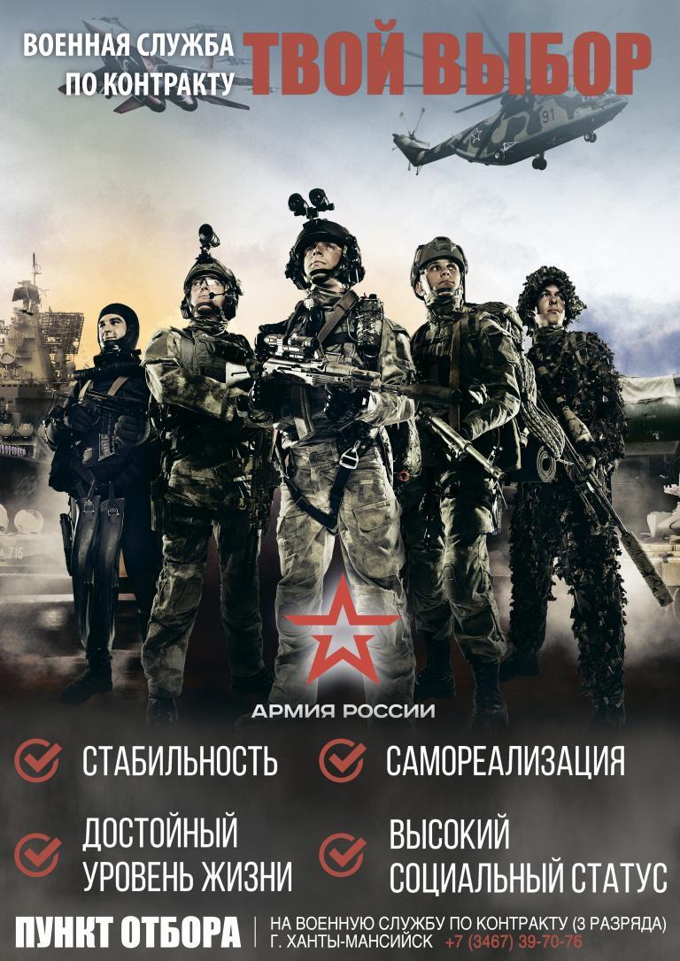 Пункт отбора на военную службу по контракту по ХМАО - Югре продолжает отбор кандидатов для поступления на военную службу по контракту в воинские части Центрального военного округа, а также сообщает, что в соответствии с Федеральным законом от 28 марта 1998 года НР 53-ФЗ гражданам, подлежащим призыву (призывникам) и получившим высшее или среднее профессиональное образование, предоставлено право заключить контракт о прохождении военной службы в Вооруженных Силах Российской Федерации на два года вместо одного года военной службы по призыву.