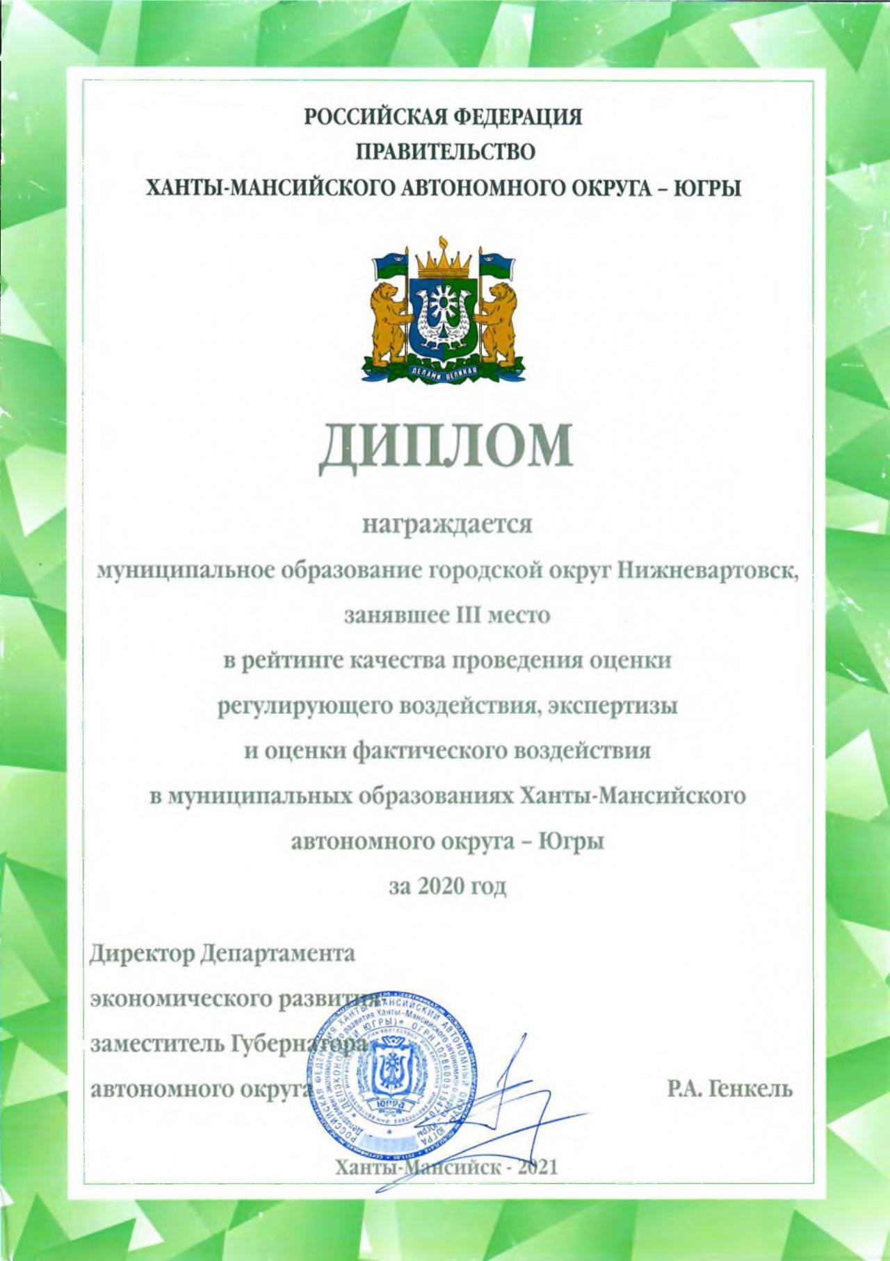 Нижневартовск отмечен среди муниципальных образований, добившихся значительных успехов по эффективному взаимодействию с бизнес сообществом, опыте использования количественных методов и анализа издержек при проведении ОРВ, а также в "лучших практиках" проведения ОРВ, экспертизы и ОФВ.