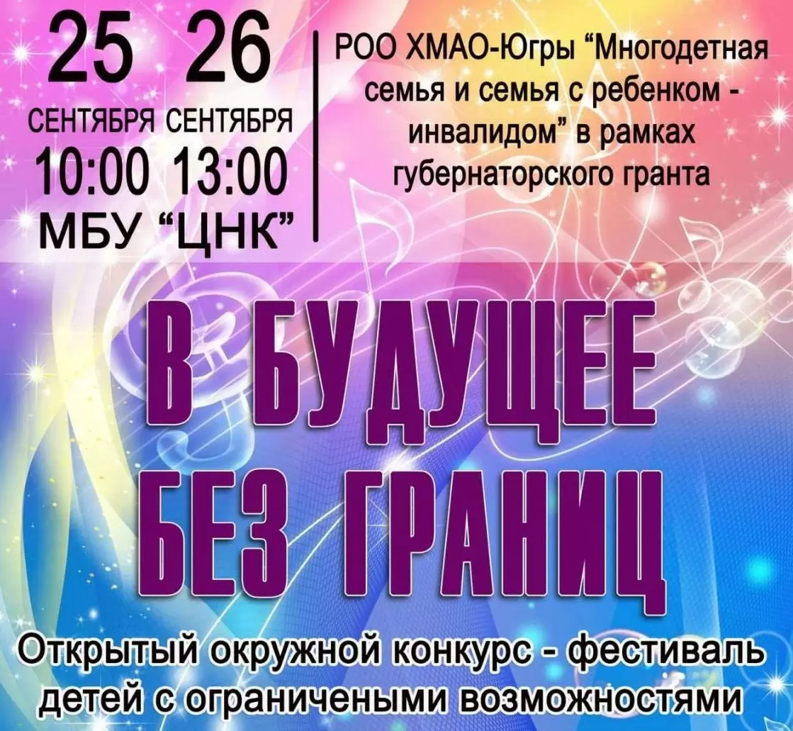 Открытый окружной конкурс-фестиваль детей с ограниченными возможностями здоровья «В будущее без границ» проводится в рамках реализации гранта Губернатора Югры. Цель фестиваля - создание условий для реализации творческих способностей детей и подростков с ограниченными возможностями здоровья и освещение их деятельности в социальных сетях.