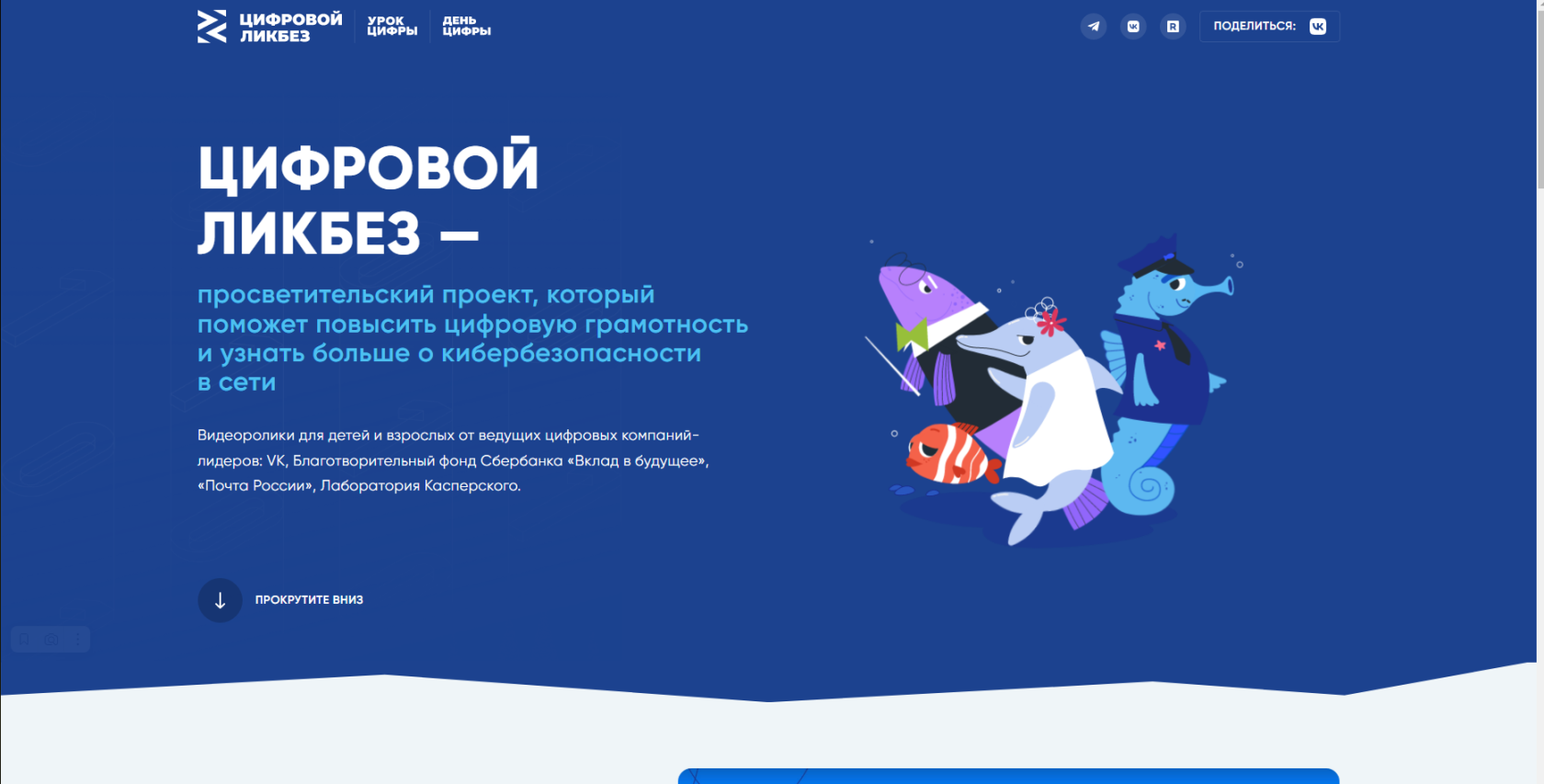 «Цифровой ликбез» с помощью образовательных видеороликов учит школьников цифровой грамотности и правилам. В роликах рассказывают, как распознать фишинговую ссылку, защитить личную информацию в сети или как противостоять кибербуллингу. На сайте «Цифрового ликбеза» подростки познакомятся с новыми героями, жителями подводного мира и придуманного города Нижнефорельска — рыбкой-блогером Антоном Корюшкиным, нерпой Женей, крабом Кирой и другими морскими жителями.