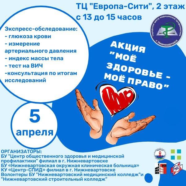 5 апреля в Нижневартовске состоится акция, приуроченная ко Всемирному дню здоровья. Мероприятие пройдёт с 13 до 15 часов в ТЦ "Европа-Сити" (территория возле фонтана).