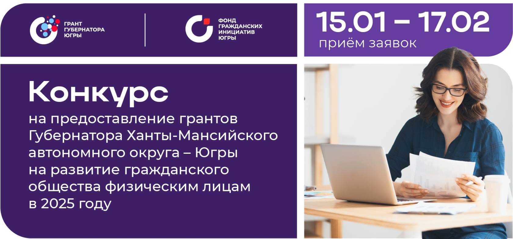 С 15 января стартовал приём заявок на грант губернатора Югры на развитие гражданского общества. Стать участниками конкурса могут жители Ханты-Мансийского автономного округа – Югры и города Макеевки в возрасте 14 лет и старше. Размер грантовой поддержки – от 50 тысяч до 1 миллиона рублей.