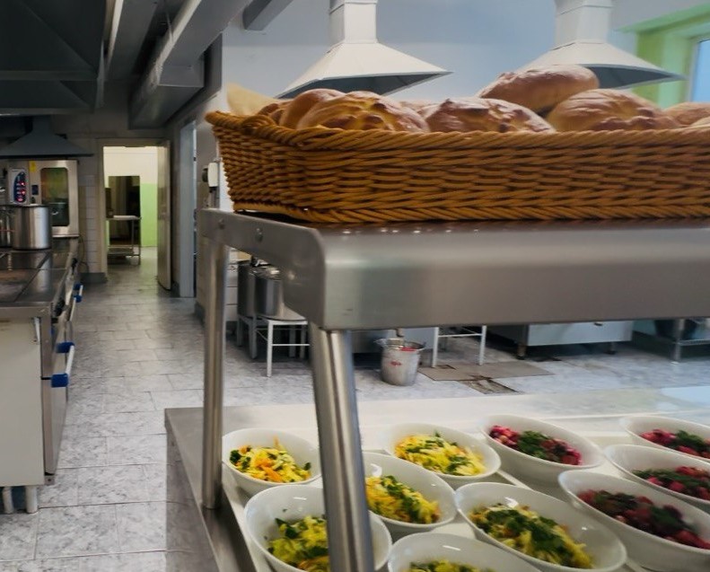В столовой можно ознакомиться с меню на день. В рацион включены разнообразные блюда: творожные в виде пудинга и сырников, омлет, мясные блюда, рыба, салаты, выпечка.