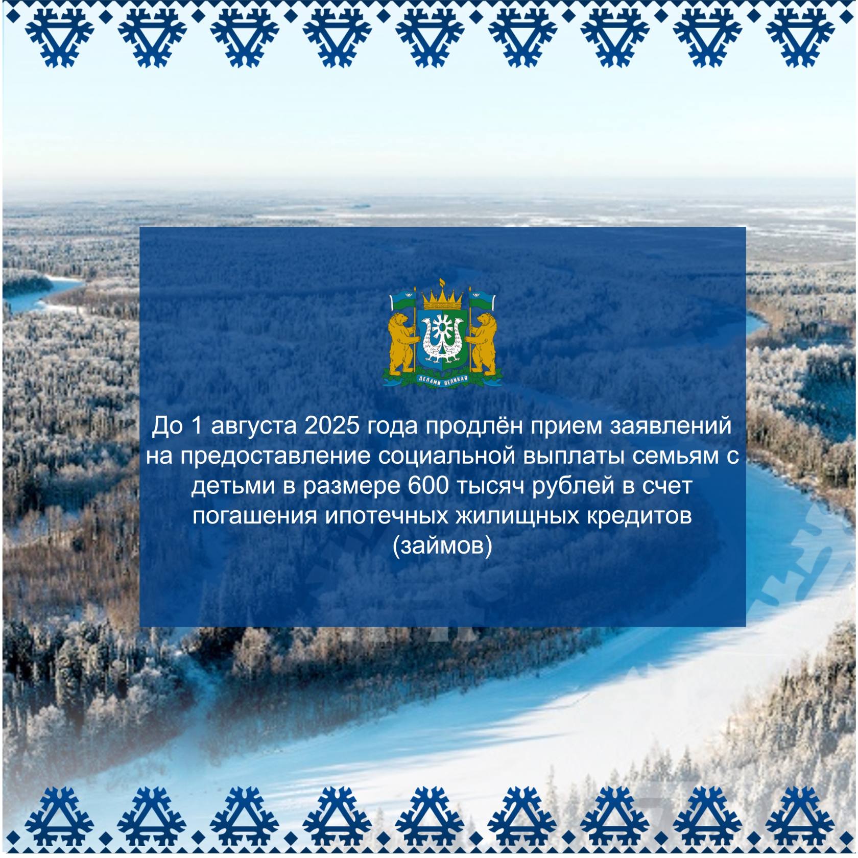 До 1 августа 2025 года продлён приём заявлений на предоставление социальной выплаты семьям с детьми в размере 600 тысяч рублей в счёт погашения ипотечных жилищных кредитов (займов). Социальная выплата предоставляется в рамках государственной программы Ханты-Мансийского автономного округа – Югры «Строительство».