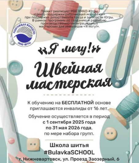 Она нацелена на создание и развитие производственных мастерских, учебных площадок для проведения практических занятий по формированию у инвалидов профессиональных и трудовых навыков по профессиям швейной промышленности (швея, портной, стилист, дизайнер одежды). Занятия бесплатные. Они проходят на базе школы шитья BulavkaSCHOOL (проезд Заозерный, 6).