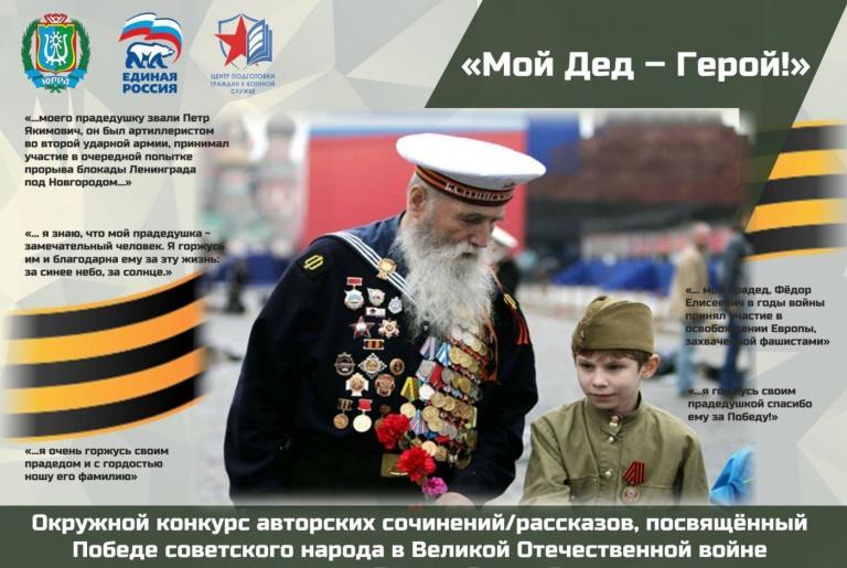 Конкурс «Мой Дед - Герой!» инициирован региональным отделением партии «Единая Россия» и окружным Центром военно-патриотического воспитания и подготовки граждан к военной службе. В творческом состязании приняли участие все образовательные центры Нижневартовска. Автором лучшего сочинения «Правнуки победителей» стал ученик 11 класса школы № 32 Владимир Хорев. Его работа отправлена на региональный уровень. Имена всех победителей назовут после утверждения итогов творческого состязания окружным оргкомитетом. В ближайшее время ребята встретятся с организаторами конкурса, а затем они отправятся в поездку по местам боевой славы в город-герой Москву.