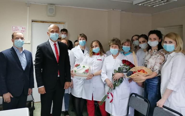 Председатель Молодёжного парламента при Думе города Тарас Чиканцев и Андрей Смолин поздравили медицинских работников детской поликлиники №4.