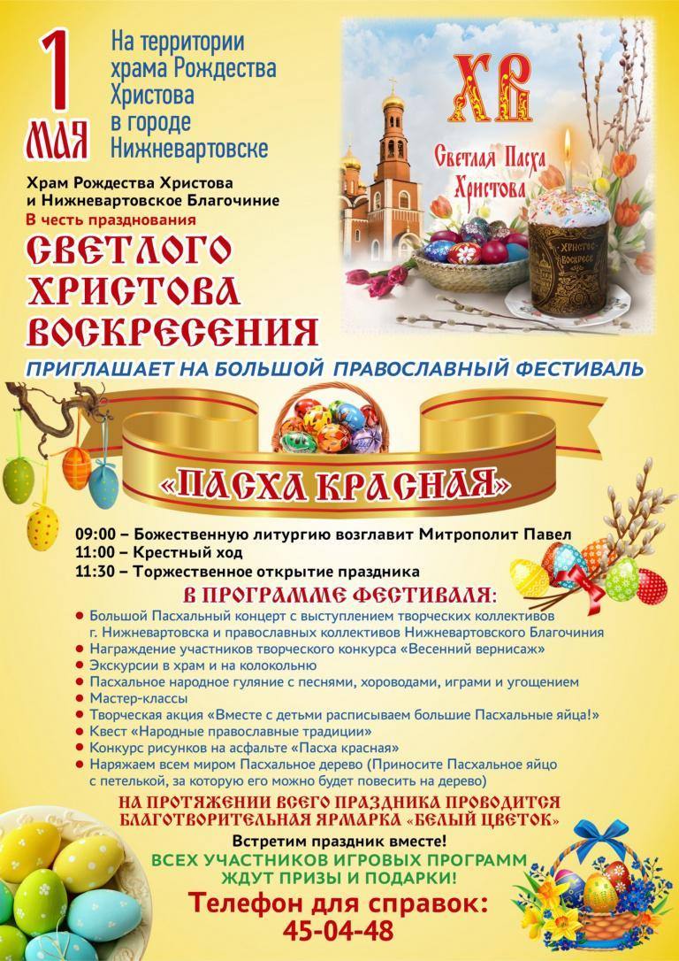 1 мая на территории храма Рождества Христова состоится ежегодный фестиваль православной культуры «Пасха Красная» в честь празднования Христова Воскресения.