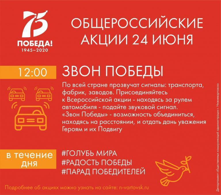 В 12 часов жителей города приглашают принять участие в акции «Звон Победы». В это время по всей стране одновременно в течение минуты раздадутся гудки транспортных средств – от личных автомобилей до общественного и грузового транспорта. Также в это время в Нижневартовске по городской системе оповещения населения раздастся звуковой сигнал.