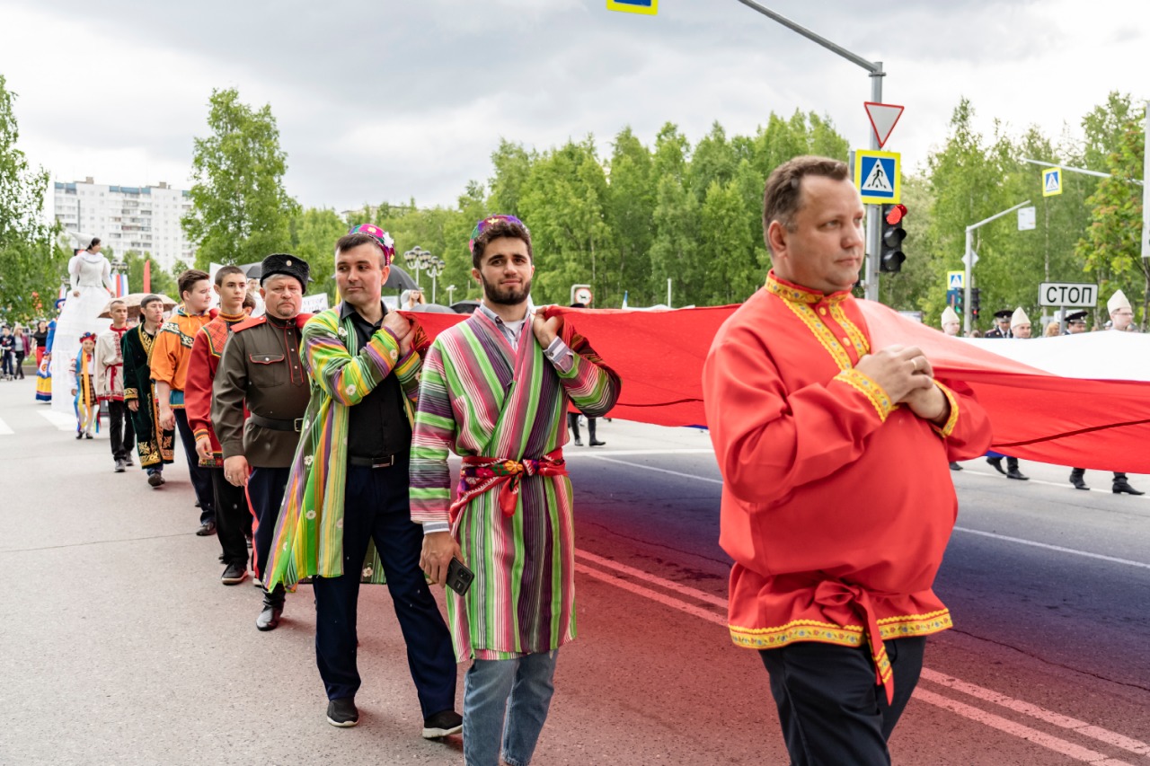 На площади Нефтяников руководители городских национальных организаций все вместе исполнили гимн Российской Федерации, после чего колонна участников, состоящая из сотни человек, в народных костюмах прошла по проспекту Победы. В руках они пронесли многометровый триколор. А уже у монумента «Флаг города» на городской набережной, участники шествия присоединились к традиционному празднику дружбы народов.