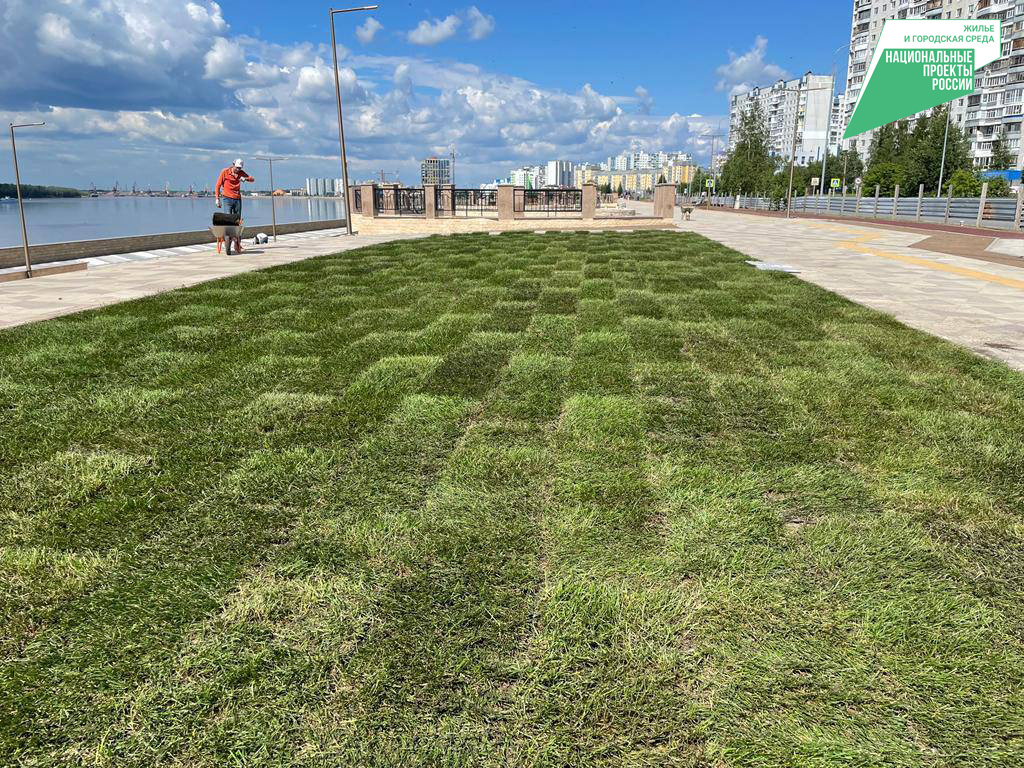 Особенность в том, что зеленый газон на территории появится сразу. При благоустройстве данной зоны власти города решили применить устройство рулонного газона.