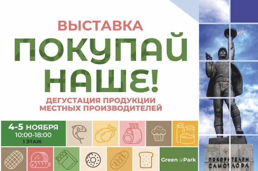 4-5 ноября с 10 до 18 часов в МФК «Green Park» (1 этаж) пройдет выставка «Покупай наше», где будут представлены: молочная, рыбная продукция, колбасные и мясные полуфабрикаты, хлебобулочные и кондитерские изделия, ремесленнические изделия, товары ручной работы местных мастеров и многое другое.