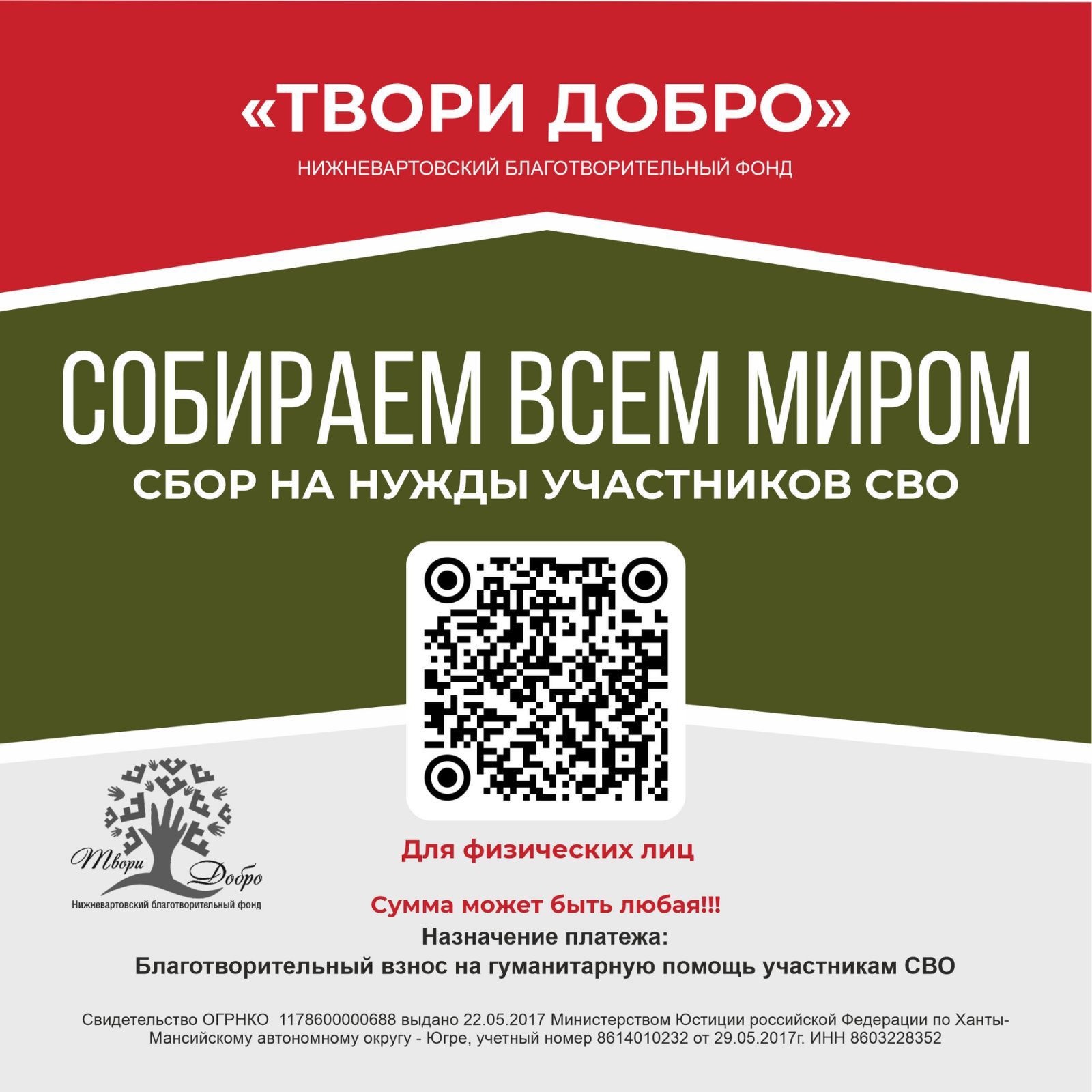 Принять участие в сборе денежных средств для поддержки нижневартовских участников СВО могут все желающие. Перечислить любую сумму можно с помощью мобильного приложения. Баннеры с QR-кодами для юридических и физических лиц – в приложении к информационному сообщению.