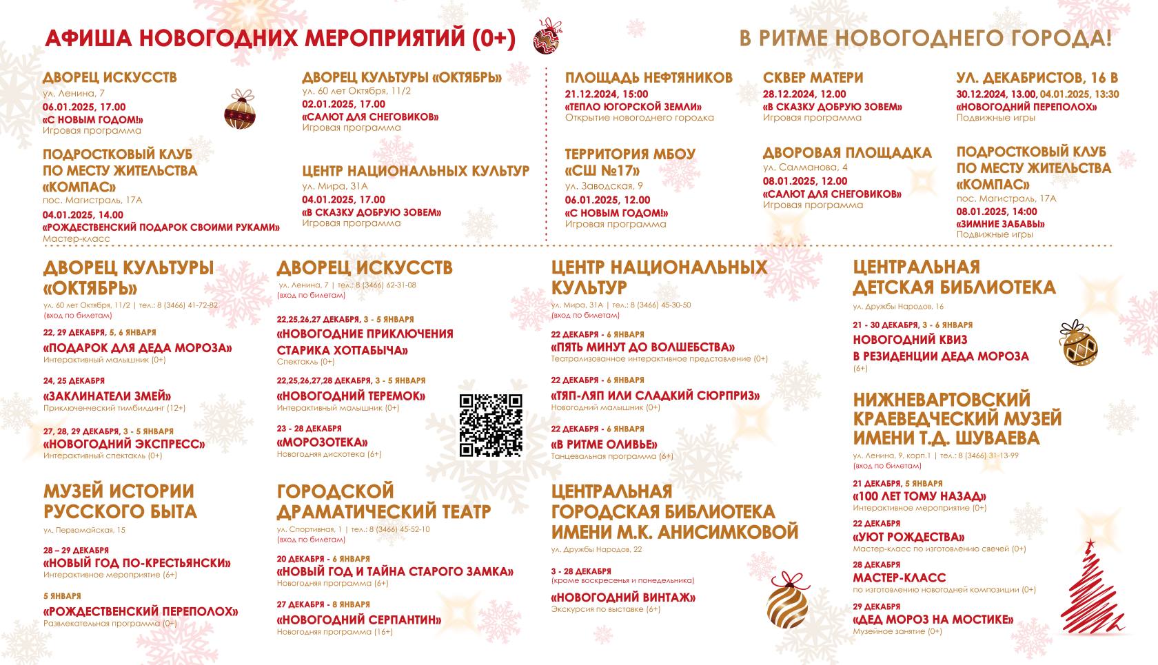 Для вартовчан и гостей города в предновогодние дни и период зимних каникул учреждения культуры подготовили около 200 праздничных мероприятий. Это мастер-классы, концерты, театрализованные представления, КВИЗы, литературные гостиные, ретро-посиделки и многое другое. Половина из них будут бесплатными.