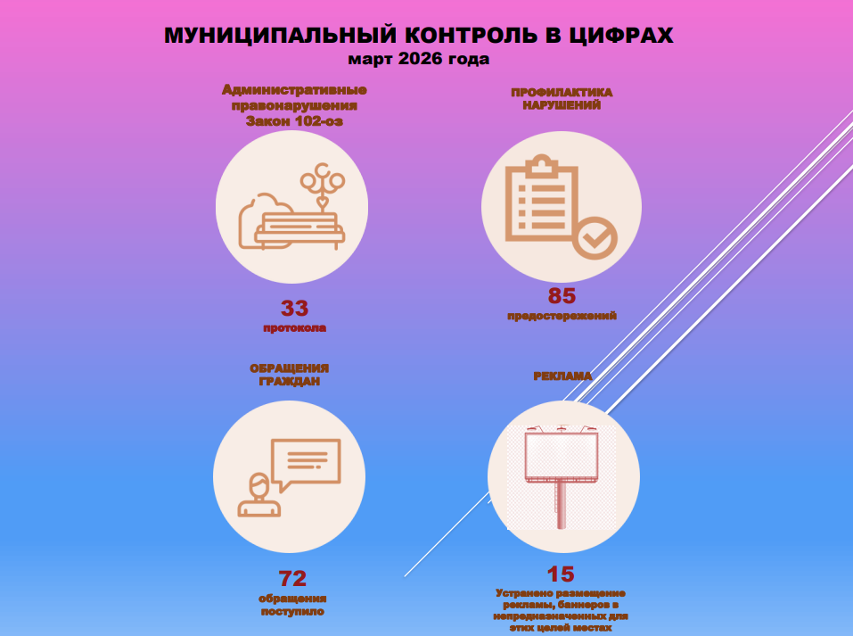 Устранено 12 нарушений правил благоустройства в части размещения баннеров, 24 владельца транспортных средств привлечены к административной ответственности за парковку на газоне, четыре административных протокола составлено за нарушения тишины и покоя, один протокол – за оставление мусора вне мусорных контейнеров. Выдано 11 предписаний на демонтаж рекламных конструкций, три рекламные конструкции демонтированы владельцами.