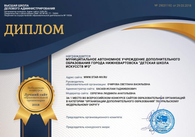 Официальный сайт нижневартовской детской школы искусств №3 занял I место во Всероссийском конкурсе сайтов образовательных организаций в категории «Организации дополнительного образования» по УрФО.
