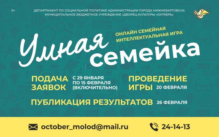 Дворец культуры «Октябрь» приглашает семьи Нижневартовска принять участие в семейной интеллектуальной игре «Умная семейка 2021». Игра, которая будет проводиться онлайн, состоит из серии интеллектуальных состязаний различного характера - шарад, головоломок, кроссвордов.