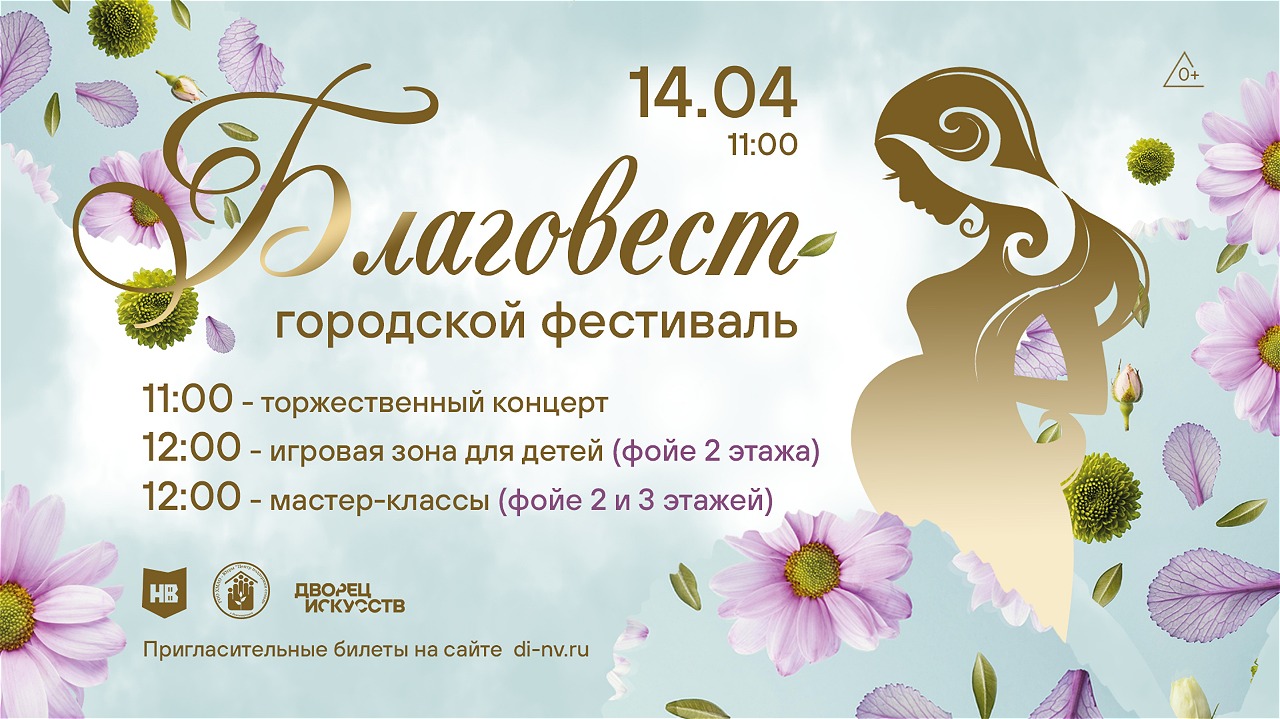 14 апреля Дворец искусств приглашает семьи Нижневартовска на самый добрый и светлый городской фестиваль «Благовест» для семей, ожидающих ребёнка. Начало в 11 часов.
