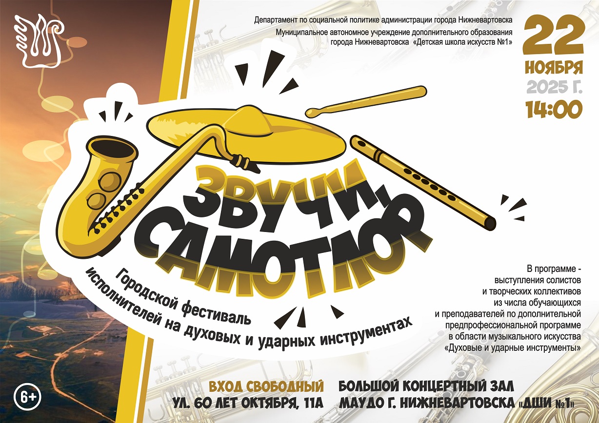 22 ноября в детской школе искусств №1 (улица 60 лет Октября, 11А) состоится городской фестиваль исполнителей на духовых и ударных инструментах «Звучи, Самотлор!».