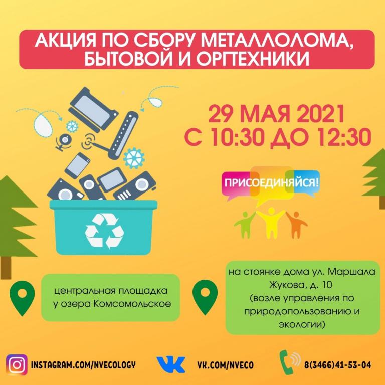 В Нижневартовске 29 мая пройдет акция «Экорасхламление». Она нацелена на сбор металлолома, отработанной бытовой и оргтехники. Принять участие в экологическом мероприятии приглашаются жители города.