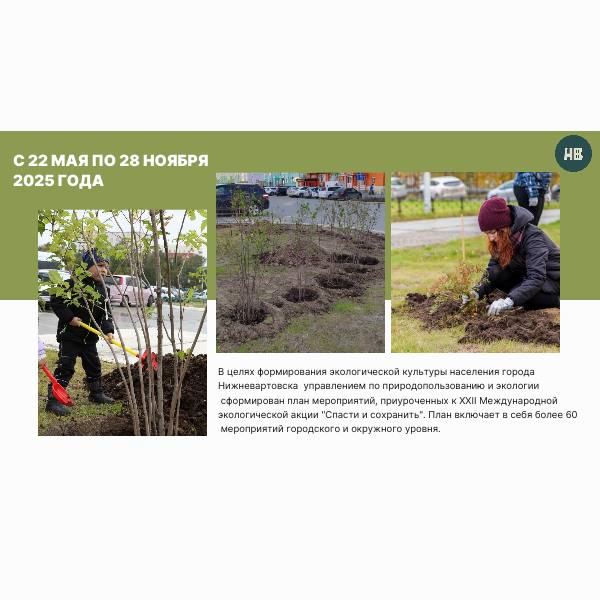 В целях формирования экологической культуры населения Нижневартовска управлением по природопользованию и экологии администрации города сформирован план мероприятий, приуроченных к XXII Международной экологической акции «Спасти и сохранить». Она пройдёт с 22 мая по 28 ноября.