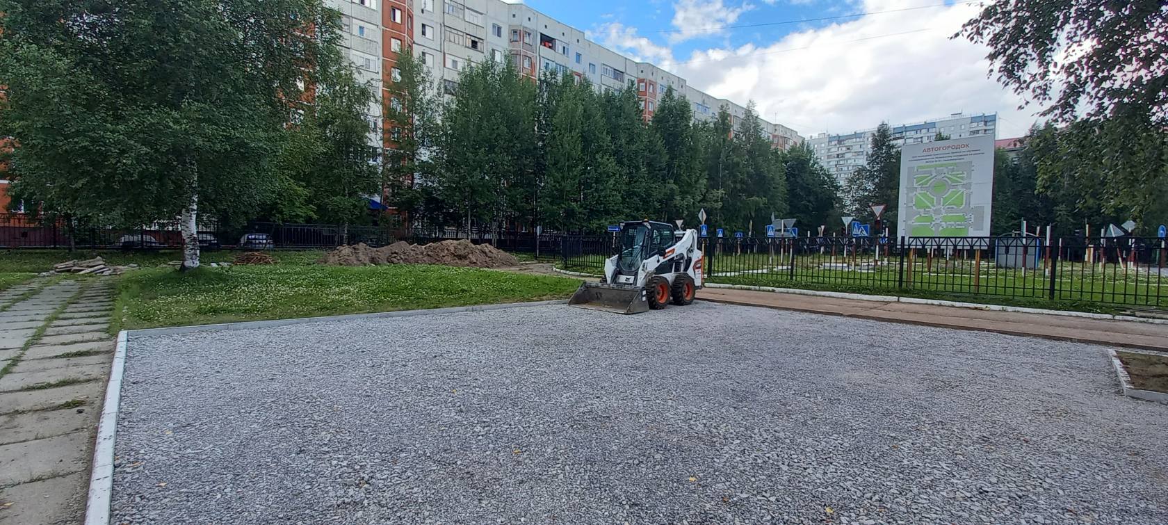 На текущую дату строители подготовили площадку для тренажеров. Произвели очистку территории от земли, демонтировали бетонные плиты, установили бордюры, покрыли площадку щебнем. Согласно календарному графику в июле производится планировка площадей и устройство основания для асфальтобетонного покрытия. На данный момент подрядная организация ждет поставку материалов. По контракту работы должны завершиться в конце августа.