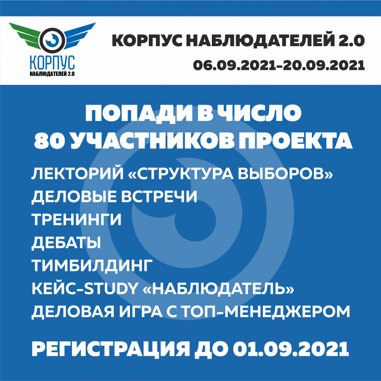 С 6 по 20 сентября пройдет мероприятие «Корпус наблюдателей 2.0». Оно проводится с целью повышения электоральной активности молодёжи, роста её правовой культуры, привлечения внимания к избирательному процессу.