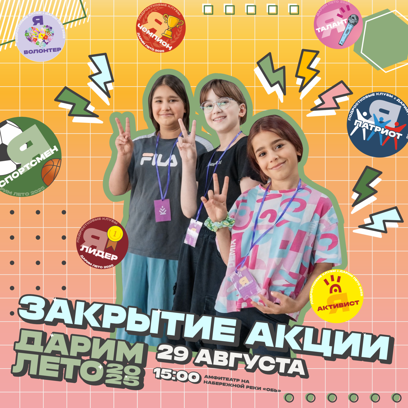Финальное событие акции «Дарим лето» состоится 29 августа с 15 до 20 часов на набережной реки Оби. Гостей ожидает музыкально-творческая программа «Уютными вечерами». Здесь подведут итог летней программы и наградят активных участников.