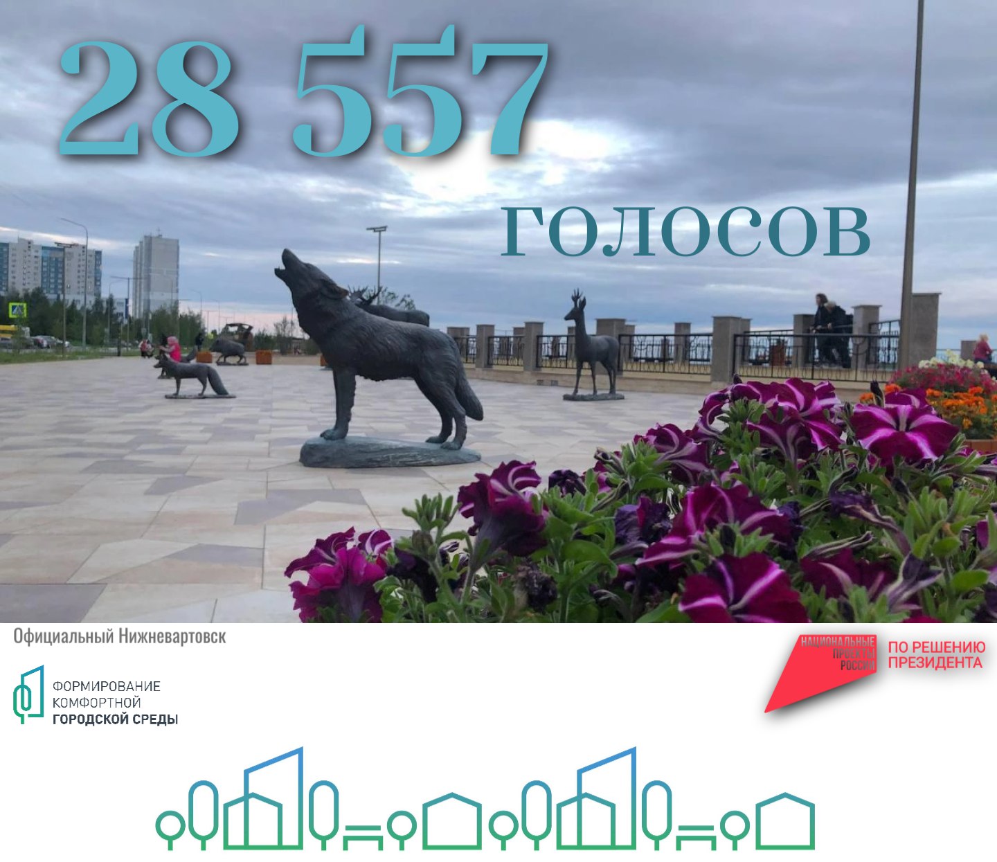 В Нижневартовске на данный момент проголосовало более 28 500 жителей. Нашему городу, чтобы в следующем году получить новое место отдыха, необходимо было набрать 28117 тысяч. Благодаря неравнодушию нижневартовцев, помощи волонтёров и всех заинтересованных в развитии города людей, этот показатель удалось достичь досрочно. Окончательные итоги после верификации всех голосов по России подведёт Минстрой России.