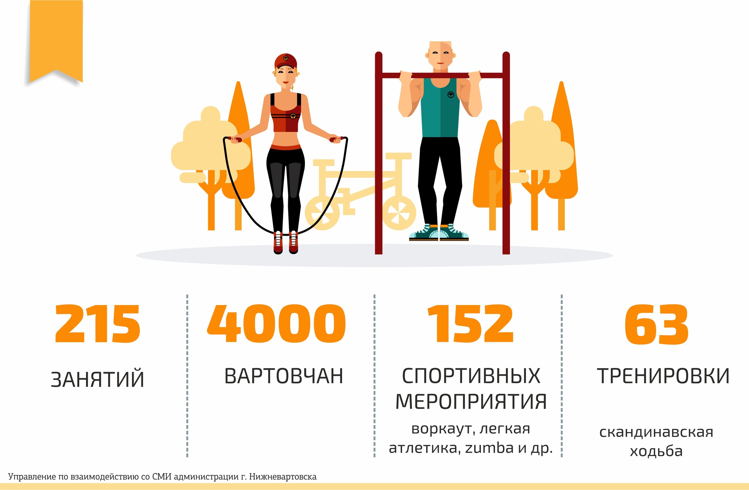 В Нижневартовске завершился сезон проведения бесплатных фитнес-тренировок под открытым небом. В этом году за три летних месяца было проведено более 200 занятий на Комсомольском озере, набережной реки Обь, в Парке Победы, на территориях спорткомплексов «Олимпия» и «Юбилейный». Их посетили около 4000 вартовчан.