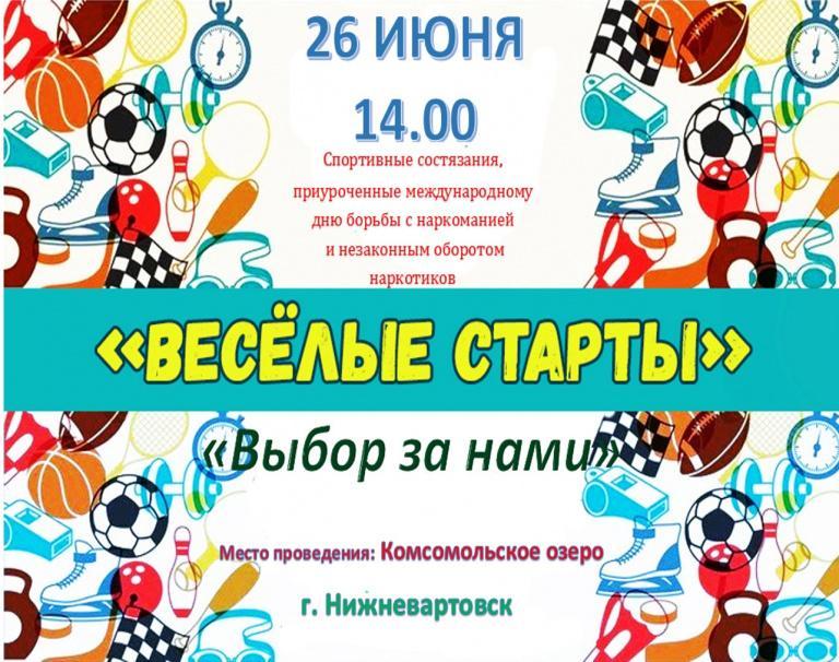 Подростки Нижневартовска станут участниками «Веселых стартов». Соревнования пройдут 26 июня в 14 часов на Комсомольском озере в рамках Международного дня борьбы с наркоманией. Мероприятие проводится специалистами Нижневартовской психоневрологической больницы совместно с участниками общественной организации «Страна без наркотиков. Югра» при поддержке администрации города и ФСК «Юбилейный».