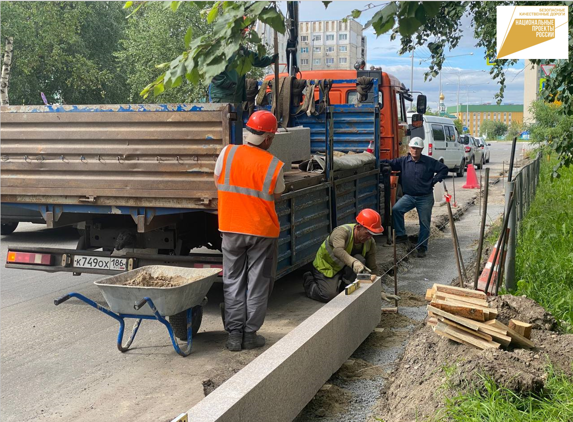 В Нижневартовске благодаря реализации нацпроекта «Безопасные качественные дороги» на городских улицах появляется новая «дорожная одежда». На улице Маршала Жукова (между улицами Мира и Ленина) устанавливают бордюрный камень из гранита.