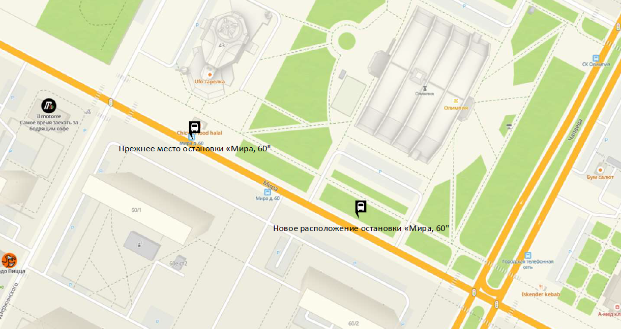 На улице Мира в створе улиц Чапаева и Дзержинского меняют расположение остановочного пункта «Улица Мира, дом 60» (нечетная сторона). Новая локация остановки будет находиться ближе к улице Чапаева. Прежняя остановка (ближе к улице Дзержинского) не будет использоваться с 7 июля.