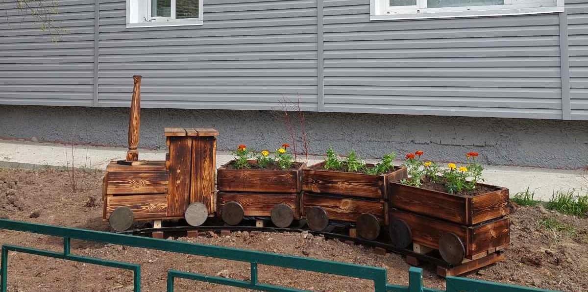 К примеру, необычный вазон в форме паровоза появился благодаря работе УК «Диалог». Такую конструкцию для цветов установили на нескольких придомовых территориях. Вместе с жителями посадили бархатцы, агератумы, алиссумы.