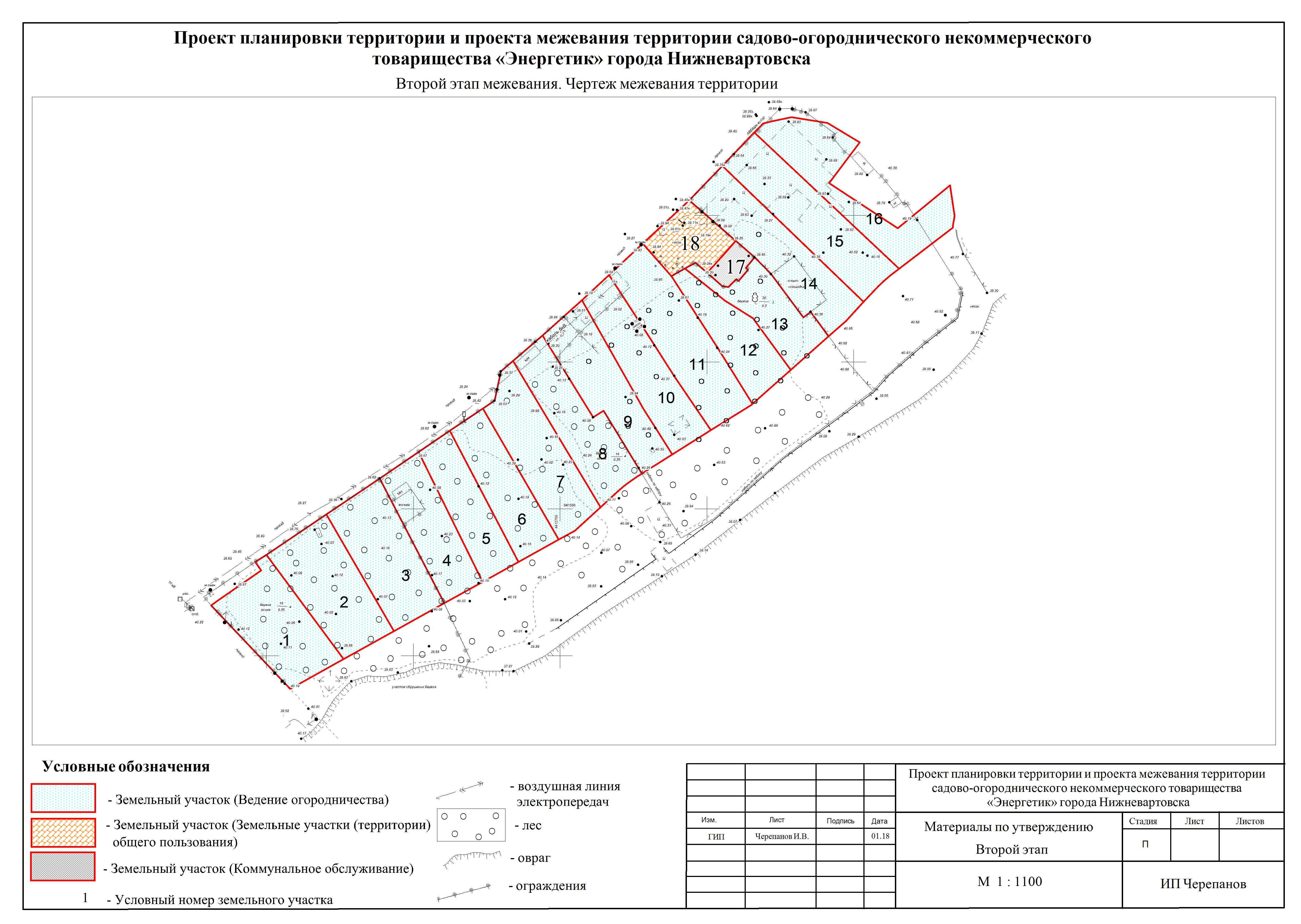 Утверждены постановлением администрации города Нижневартовска от 18.07.2018 №1024 "Об утверждении проекта планировки территории и проекта межевания территории садово-огороднического некоммерческого товарищества "Энергетик" города Нижневартовска"